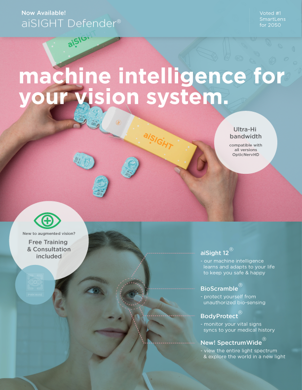 My Idea: I am imagining this as an advertisement for a 'smart' contact lens. I'm interested in exploring what could be possible in 2050 to combine artificial intelligence with the vision system; and what challenges that could help overcome as well as potential for augmentation of current abilities.